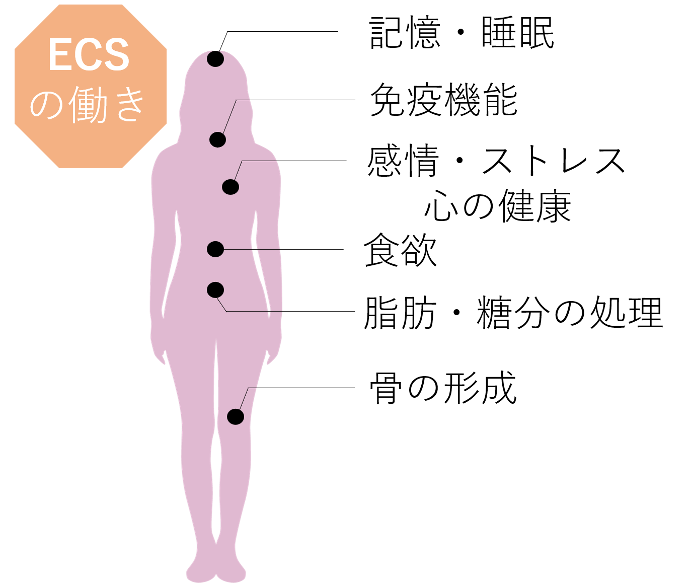 体内には、本来備わっている身体調節機能=内因性カンナビノイド系(ECS)があります。内因性カンナビノイド系は、食欲、痛み、免疫調整、感情制御、運動機能、発達と老化、神経保護、認知と記憶などの機能をもち、細胞同士のコミュニケーション活動を支えています。